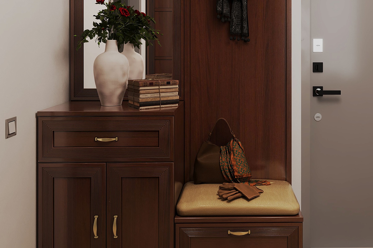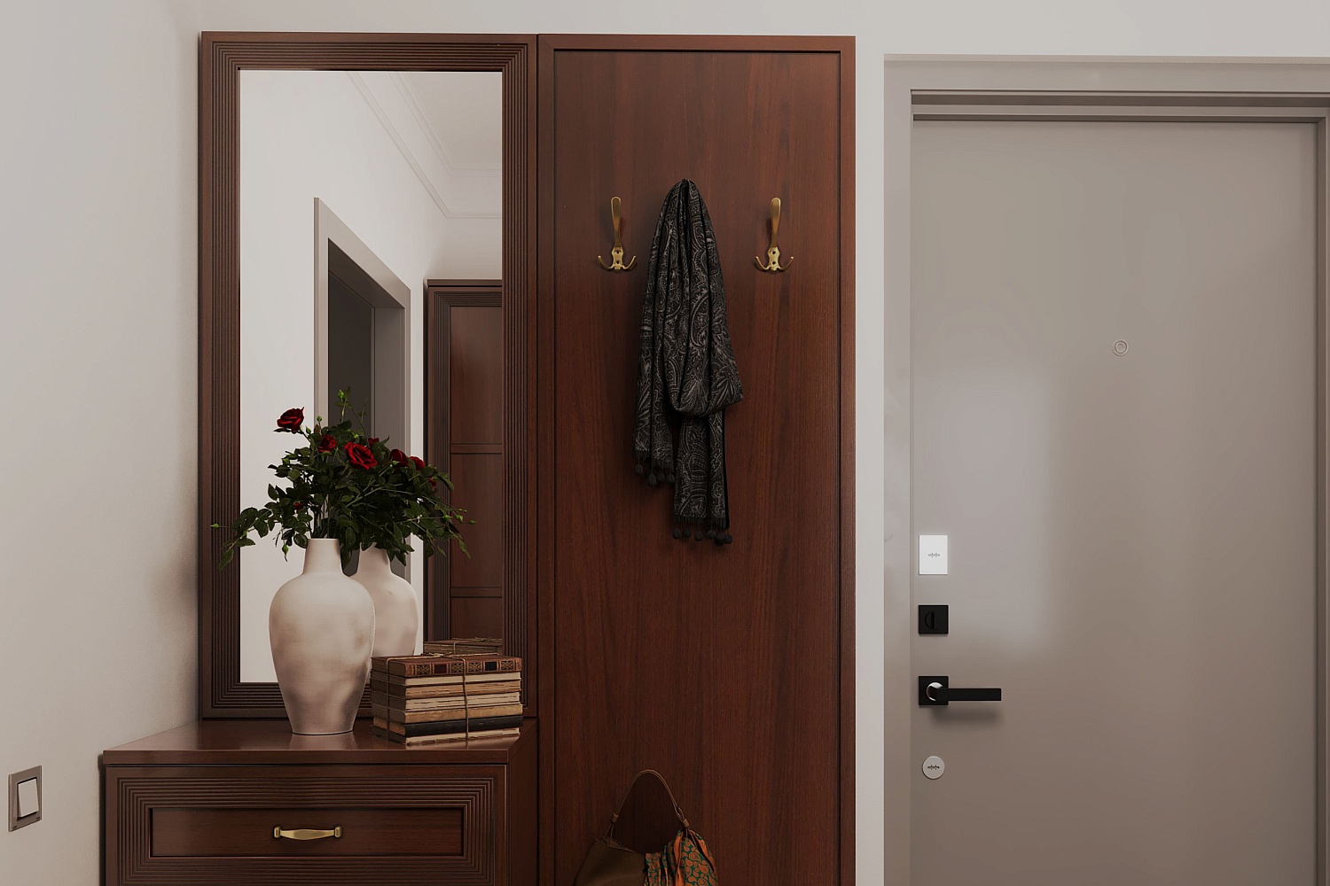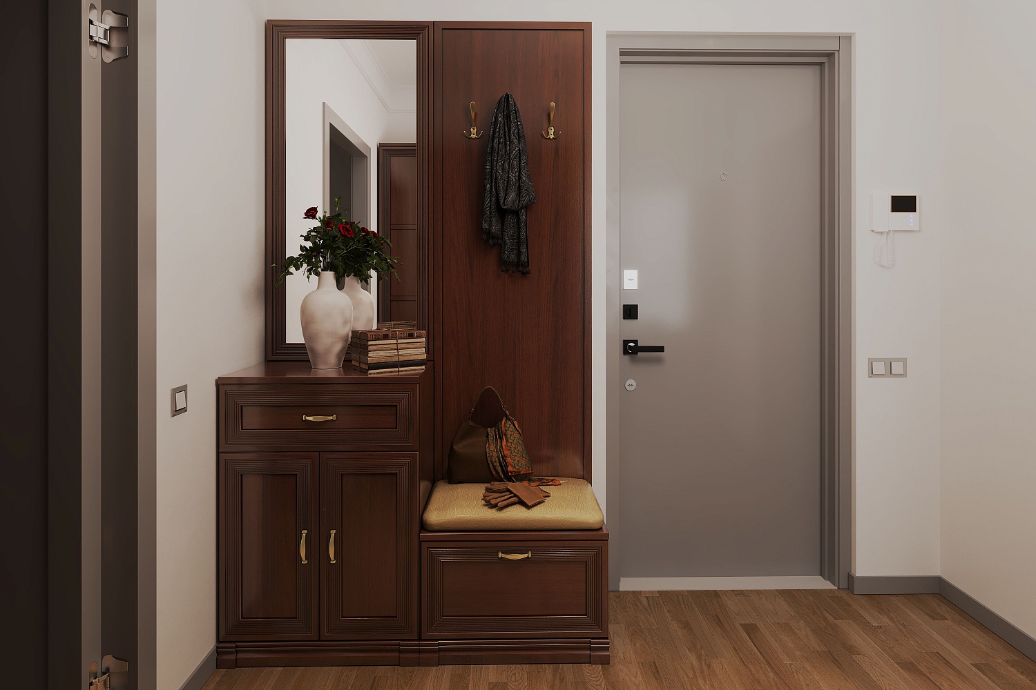 - Вешалки позволят разместить верхнюю одежду, а тумбочки сохранят в чистоте обувь и аксессуары.