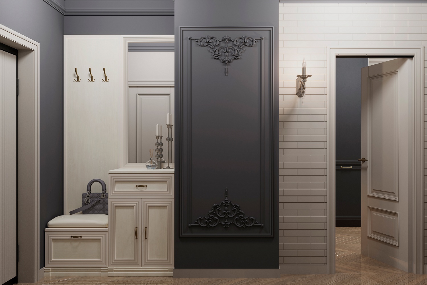 - Прихожая будет гармонировать с пастельными оттенками бирюзы, синего, терракотового, теплого серого. Если же вы хотите добавить акцентов в декоре — используйте глубокие оттенки тонов, перечисленных выше;