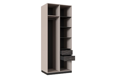 - За глухим фасадом шкафа МИ-201.03 установлена штанга для одежды и полка ЛДСП, за стеклянным – 3 полки ЛДСП;