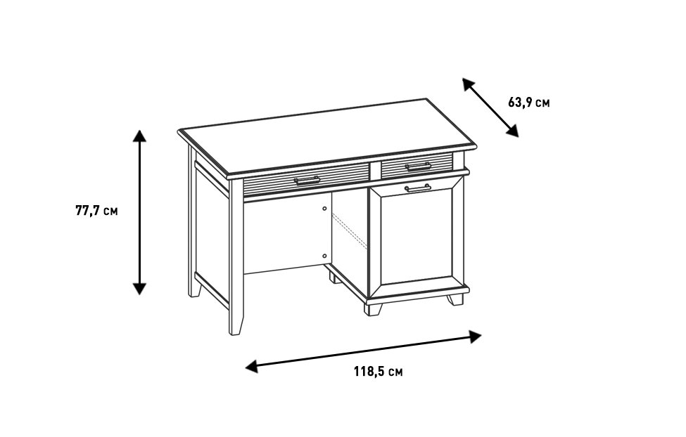 - Под столешницей — отделение с двумя выдвижными ящиками. На задней стороне стола — фальшпанели (с декоративными профилями), повторяющие внешний вид фасадов ящиков;